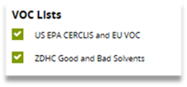 · SDS with VOC –仅显示同时满足以下条件的产品:拥有 SDS 文件,且根据美国 EPA CERCLIS 标准、欧盟 VOC 法规及 ZDHC 优良与不良溶剂清单分类,含有挥发性有机化合物。