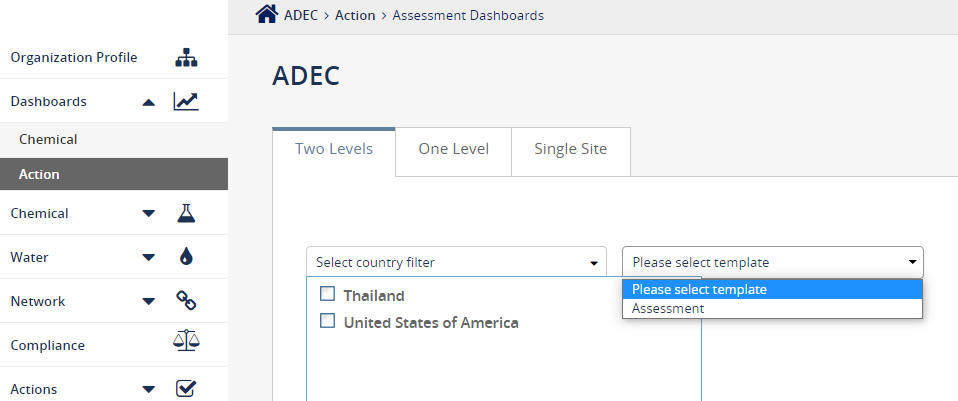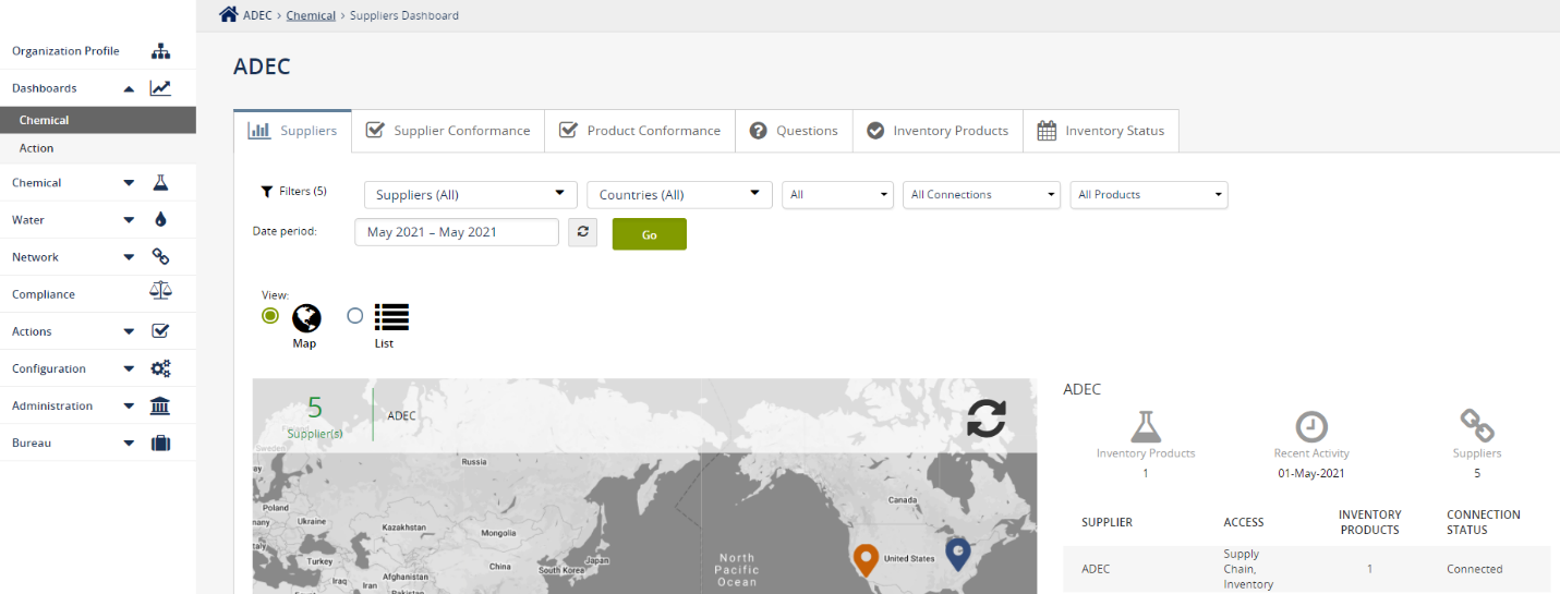 在 CleanChain 仪表板上,您可以找到高级报告和分析以及供应商' 化学品一致性和供应链数据。 CleanChain 有一个化学品和行动仪表板。 单击仪表盘' 下拉菜单,在化学和行动之间进行选择,即可访问仪表盘。 化学品仪表板要了解有关化学品仪表板的更多信息,请参阅《如何浏览 CleanChain 化学品仪表板(面向所有用户)?